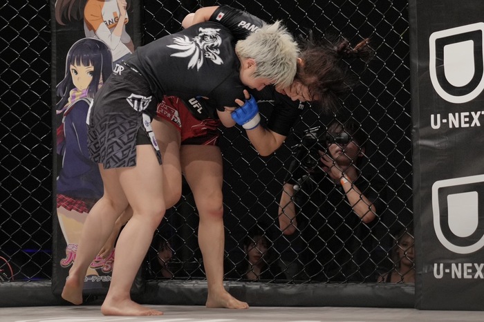 しかし左のパウンドのオノダマンが和田の頭をケージに詰めて、三角に肩を入れてインサイドガードに。中腰からパウンド。オノダマンのかつぎに頭を横にずらした和田がトップを奪い返してホーン。3者10-9和田。