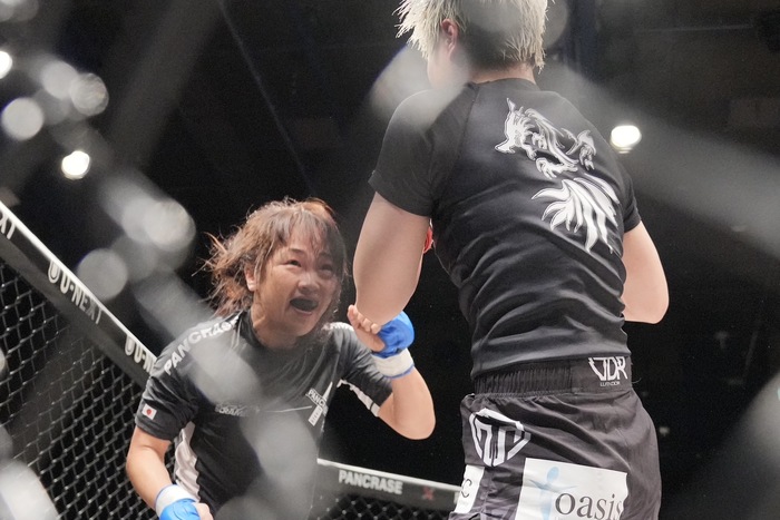 和田は下から三角絞め。オノダマンは肩をずらしてかつぎパス! ハーフから細かいパウンドを打つ。1者10-9オノダマンも、2者和田を支持。