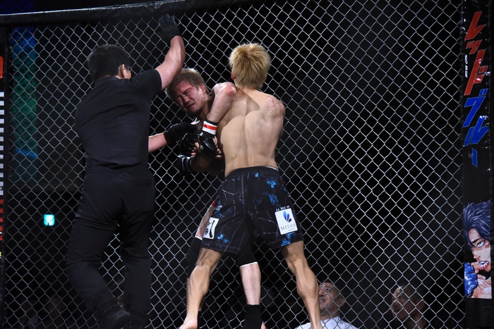 すぐに詰める御代川に、先に左フックを当てる小田。詰めて首相撲ヒザ! さらに2発に顔をしかめた御代川。右を当てて、屈んだ御代川に小田は左を9連打! 立ったまま受ける御代川にレフェリーが間に入った。