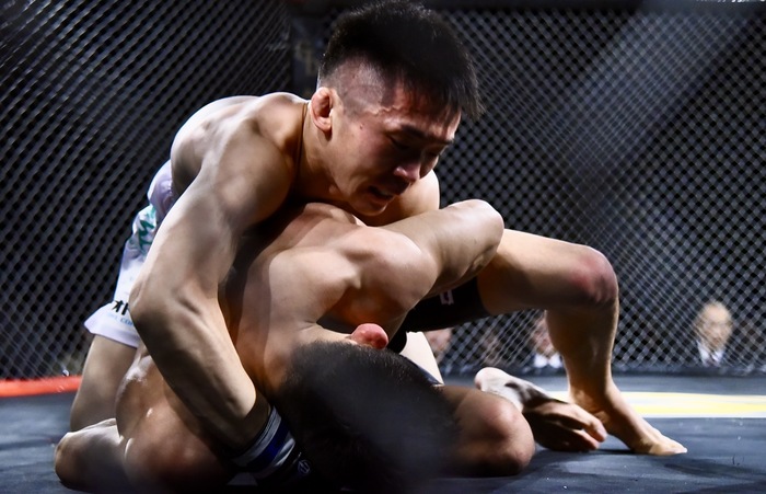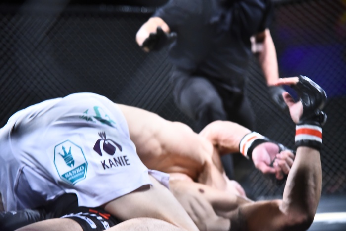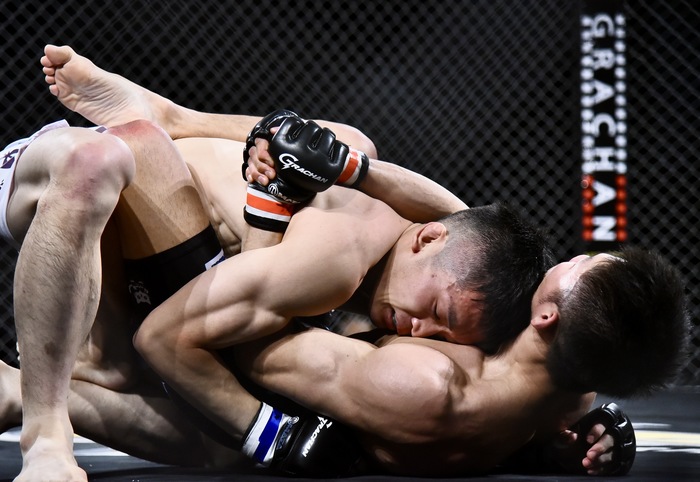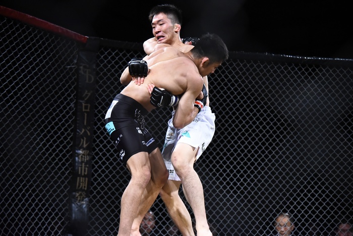 2R、スイッチを見せる徳弘に、左インローを当てる田中。徳弘は右から左で詰めて組みに。四つでケージに押し込み、互いに体を入れ替え合い、四つから徳弘は日沖発ばりに小外がけでテイクダウン! 下から両足を四角に。左脇差した左手と肩ごしからの右手でクラッチするティピーチョークで絞めに。ブレーク。