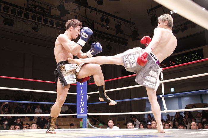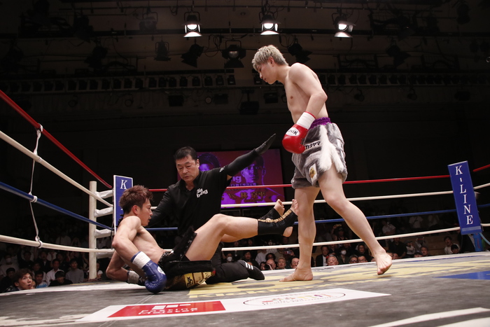 1R、右カーフを蹴る林に奥平はジャブを返す。ジャブのように三日月蹴りを刺していく奥平。林が右ローを蹴り返すと奥平は右ストレートを合わせてダウンを奪う。