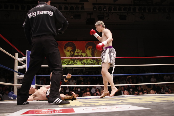立ち上がった林が打ち合いに行くが、奥平が右フックを2度ヒットさせてダウンを追加。最後は、奥平が後ろ廻し蹴りを見せてから左右の連打。ここでレフェリーがストップした。