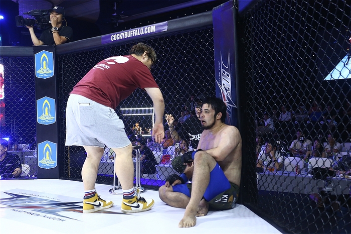 左ストレートを当てて前に出る長谷川に、アズザールガルも右から左で応戦。さらに右フックを当てると、ケージに詰まった長谷川も頭を下げての右を振る。そこに左を差し上げて倒したアズザールガル。長谷川はすぐにシングルレッグから飛行機投げの要領でテイクダウン。