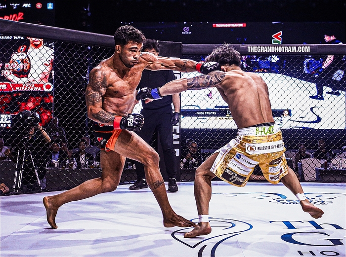 オーソの宮澤に、サウスポー構えのフレタス。宮澤は右オーバーハンドから組みに行くが、切るフレタス。左ジャブの宮澤に、左フックを返す。