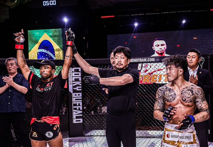 ガードを固め、遠間からダブルレッグの宮澤。スプロールするフレタスは、左足を手繰ろうとする宮澤を切って上に。左のパウンドの強打でレフェリーが間に入った。