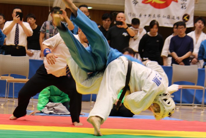 2015、2016、2017、2018、2019、2021、2022、2024年と8大会連続優勝の目黒雄太(大道塾長岡支部)は、U19全日本優勝経験のある山田凌雅(22歳、大道塾仙台東支部)、全日本空道連盟指定強化選手の田中脩斗(21歳、大道塾日進支部)を寄せつけず、決勝では、4歳からの空道歴と、高校レスリング競技実績をもち、大学生時にはキックボクシングやMMAにも取り組み、大学卒業後、大道塾総本部内弟子となった大西凜駿(22歳)にもつけ入る隙を与えず。離れてはハイキック、組めば、上段膝蹴り~豪快な首投げ、寝かせてはマウントパンチ(効果1)と、時間経過とともにワンサイドゲーム度を高め、延長戦終盤には大西を諦めの表情に至らしめた。