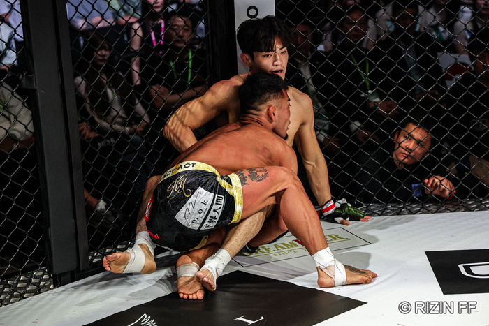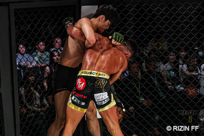 「予想して準備していた通りに出てきたので大丈夫でした。首を押し出す練習ばかりしていて、バックを取られても手首を押して外す練習をしていたんですが、まさにその通りの展開でした。正直、1Rは全くキツくなかったです。相手の息がとても荒くて、“あ、もう疲れてるな”と感じたので、このまま首を押しながら動けばいいと思いました。1Rでも打撃の道は見えてましたけど、あえて入らず、相手のスタイルを見極める時間にしました。そして2Rで打撃に行くつもりでした」
