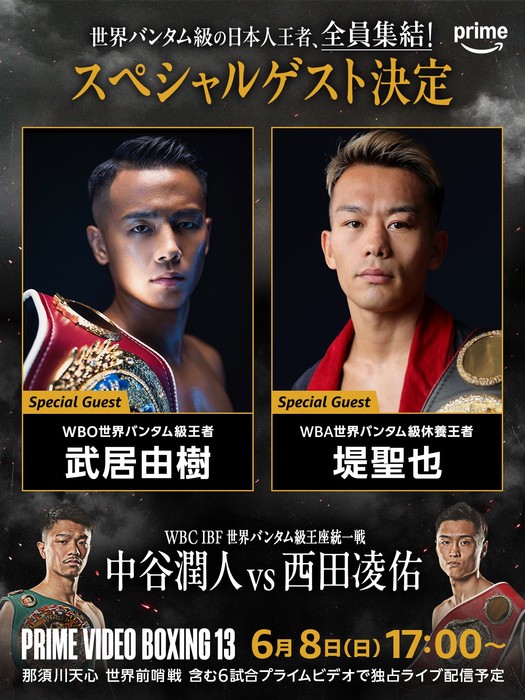 2025年6月8日(日)東京・有明コロシアム『Prime Video Boxing 13』のAmazonプライムライブ配信のスペシャルゲストとして、5月28日(水)に行われたWBO世界バンタム級タイトルマッチで勝利し、タイトルを防衛した武居由樹(大橋ジム)と、WBA世界バンタム級で現在休養王者である堤聖也(角海老宝石ジム)の出演が決定した。