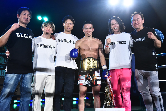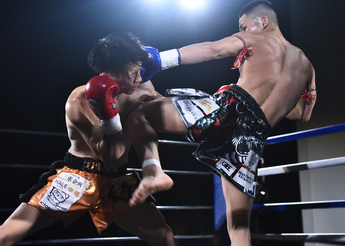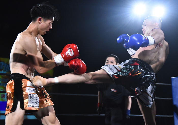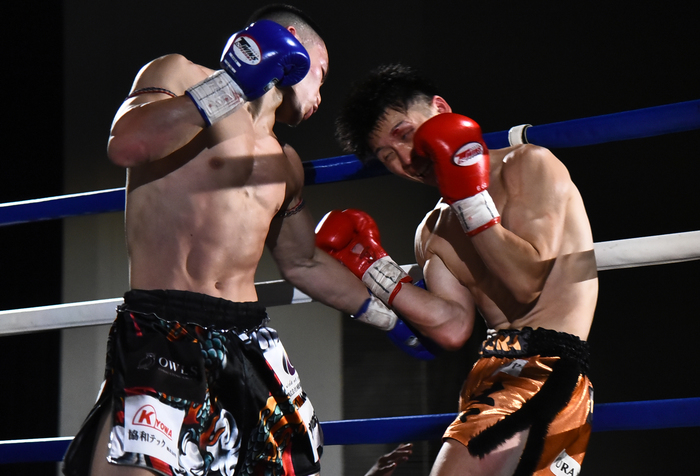 延長R、回り込むようにパンチを入れる川口に、松山はボディブローとヒザ蹴りで削っていく。ここでも大接戦となり、松山が判定勝ちで初戴冠を果たした。