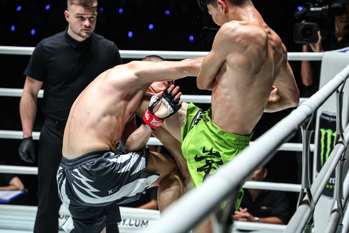 シーシュウがワンツー、左フック、左ボディ、ヒザとスピードのあるコンビネーションを決めてカリロフを防戦一方にする。技とスピードで圧倒されるカリロフは、ならばと首相撲に持ち込んでヒジとヒザ。シーシュウもヒジを打ち返す。