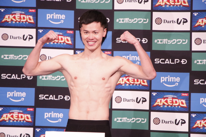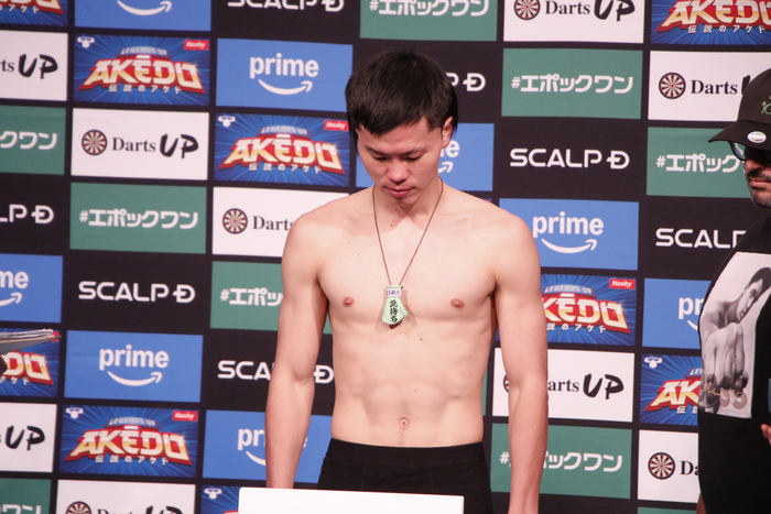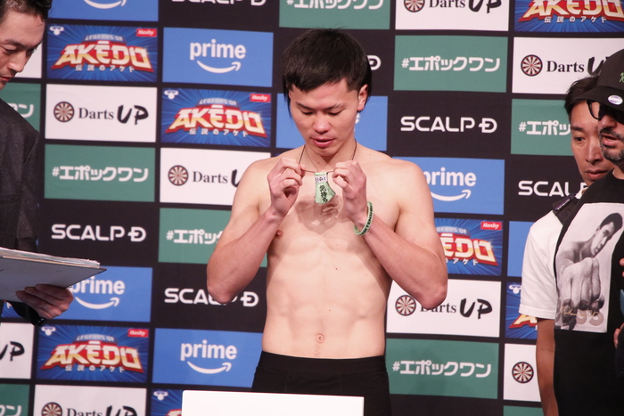 那須川天心(帝拳ジム/WBC同級1位、WBA2位、WBO2位、IBF4位)は最初秤に乗ると僅かにオーバーしたのか首から下げていたお守りを外して再び秤の上に。それでもオーバーだった様子でリストバンドを外しての再度計量でもオーバー。最後は下着を脱いで100グラムアンダーの53.4kgでパスした。