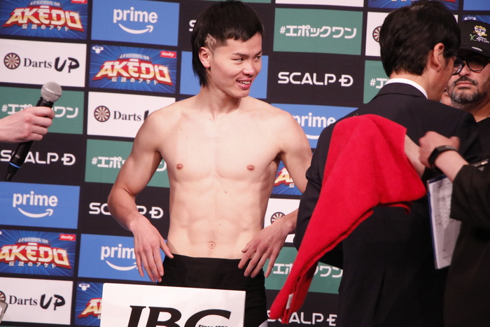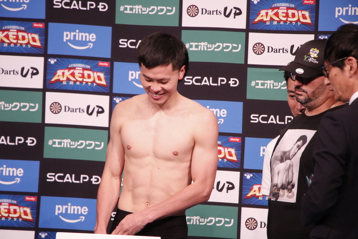 終始苦笑いだった那須川。下着を脱いでの計量パスはキックボクシング時代も含めて初めてのことだった。