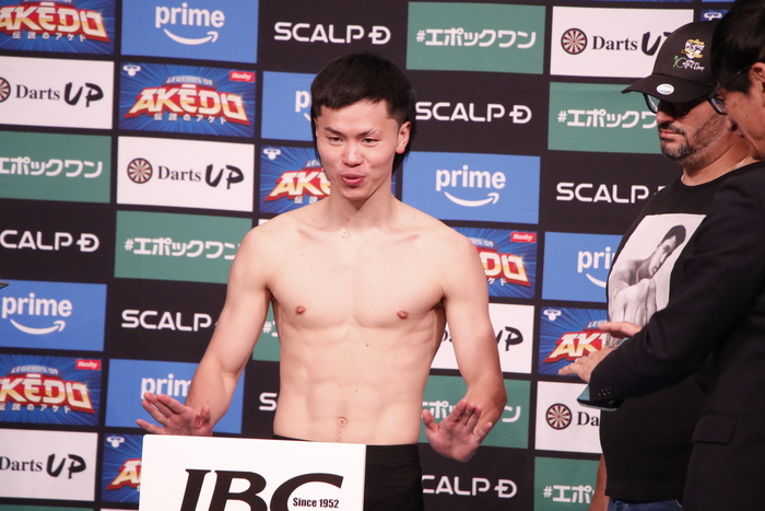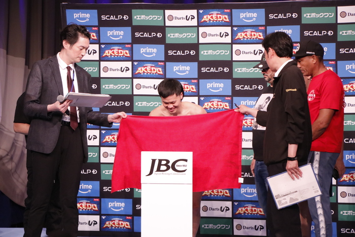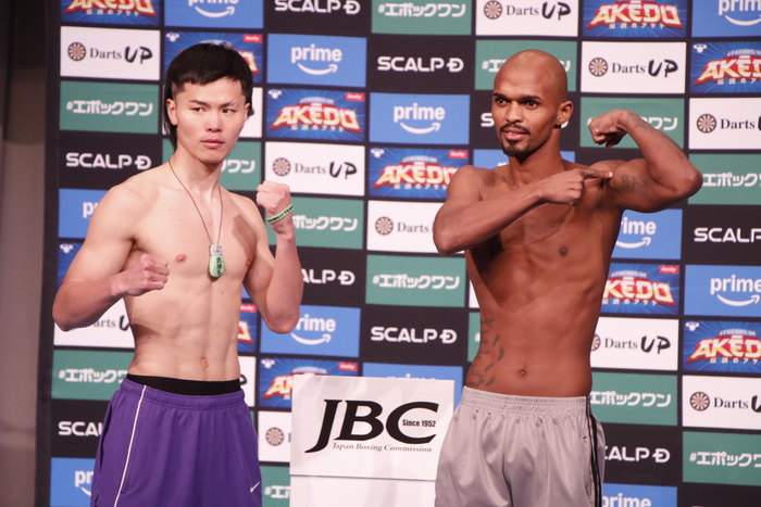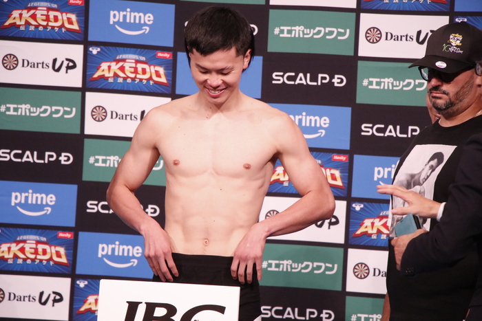 対戦相手のビクトル・サンティリャン(ドミニカ共和国/WBA同級6位)も下着を脱ぎ、リミットちょうどの53.5kgで計量をパス。