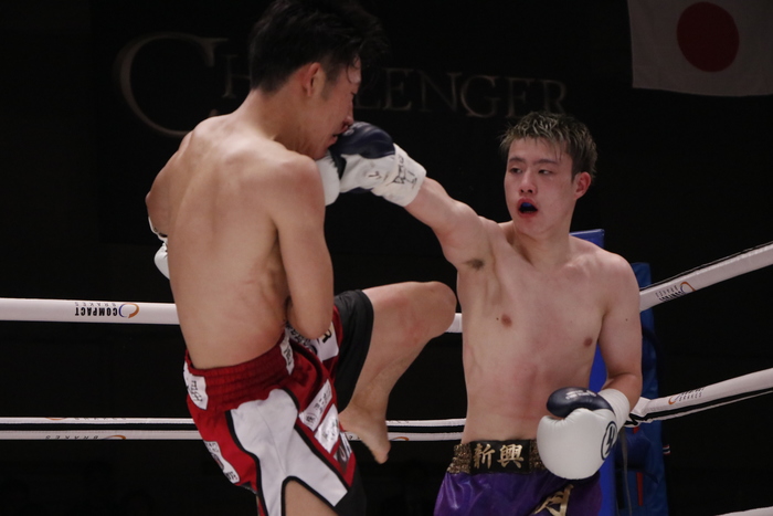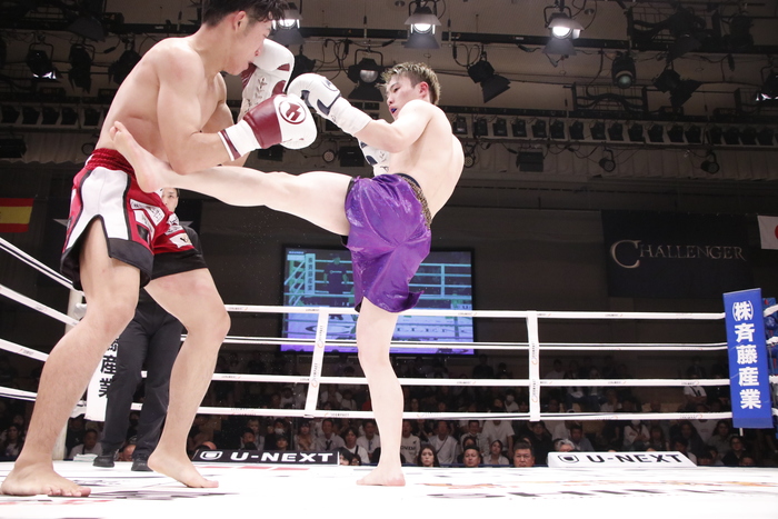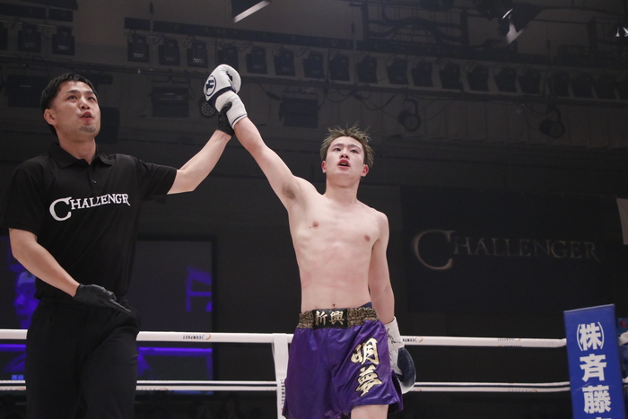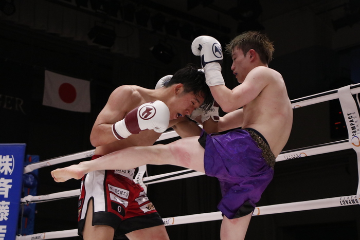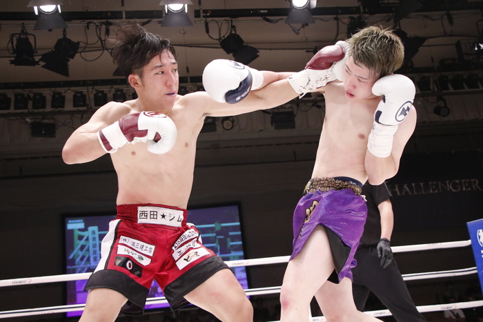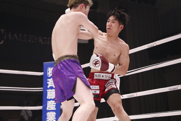 3R、明夢が左ミドルの連打で優勢に立てば、西田が右ヒジの連打で逆襲。さらに左右フックで激しく打ち合い、判定2-0で明夢が現王者を破る番狂わせを起こした。