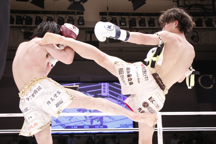 2R、前に出る王に中島は右ストレートを合わせにいき、王は右フックとローで前に出ていって組み付いていく。20-19と20-18で中島が有利。綺麗に戦いたい中島と乱戦に持ち込みたい王という図式に。