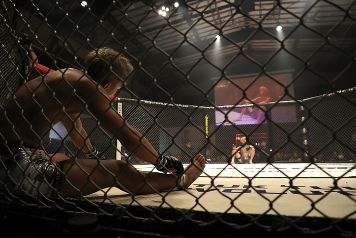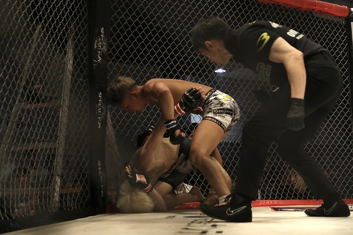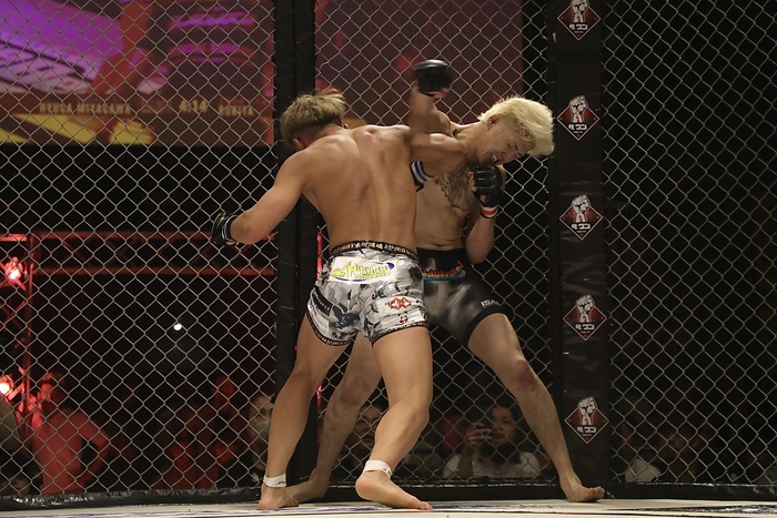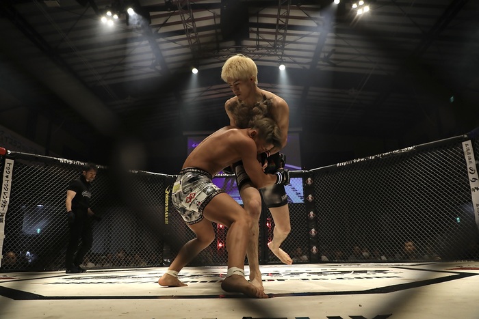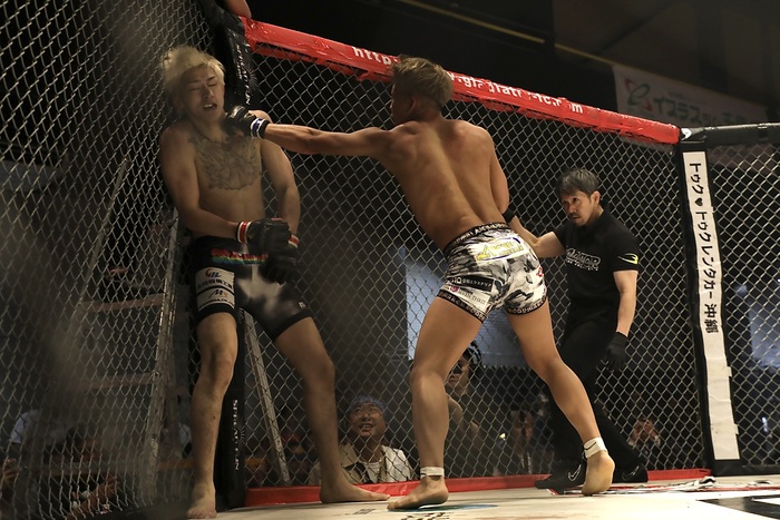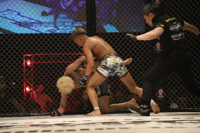 互いにノーガードの打ち合いになるが、ケージ背にする宮川にルキヤが右を当ててヒザ蹴りで宮川の腰を落とさせ、バックに。マウントから中腰になって鉄槌のルキヤ。