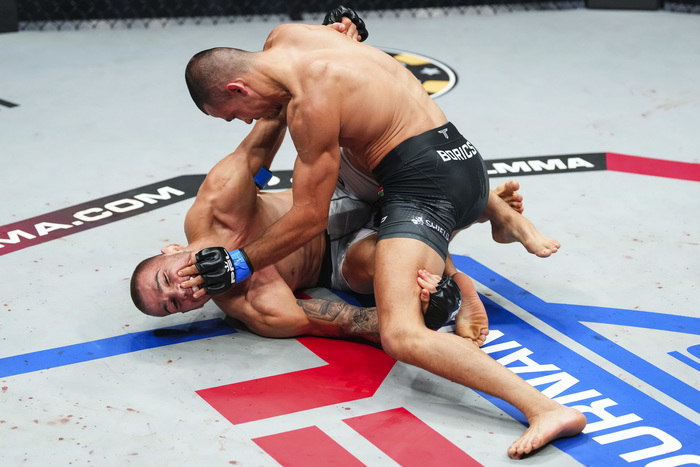 1R、ともにオーソドックス構え。圧力かけるケネディの右にボリッチは右アッパーを当てて左フックでダウンを奪うとトップに。ハーフのケネディは下から左で差すが、ボリッチは左脇に頭を押し込み、肩固め狙い。