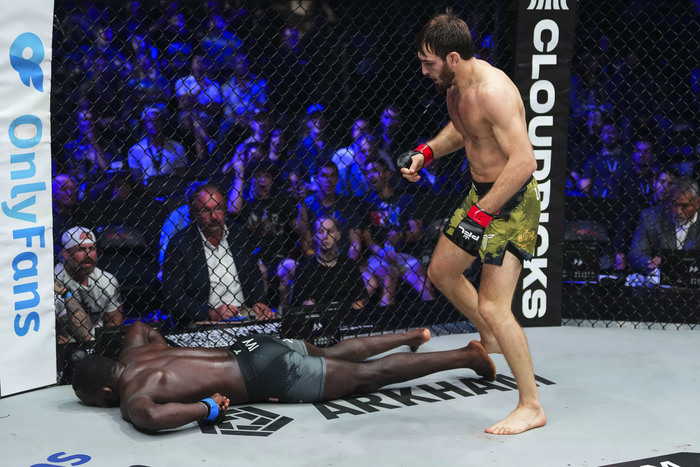 ワンツーの右から右跳びヒザで前に出るアイヴィーに、ウマラトフは左フック! 崩れたアイヴィーにさらに左フックを打ち抜き、アイヴィーが前のめりに倒れた。