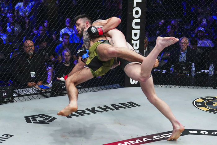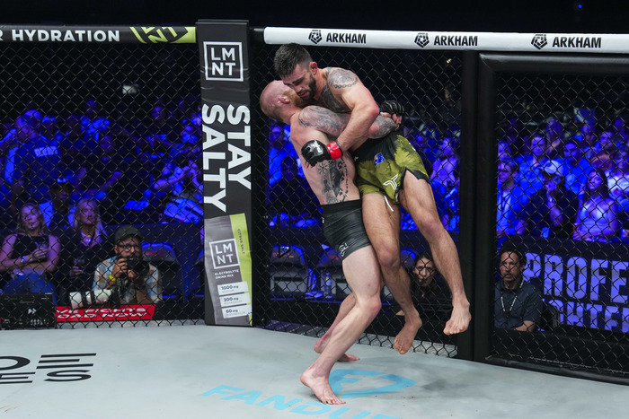 It's a dog fight! Sarek Shields throws Joseph Luciano to the ground.#PFLWorldTournament LIVE NOW