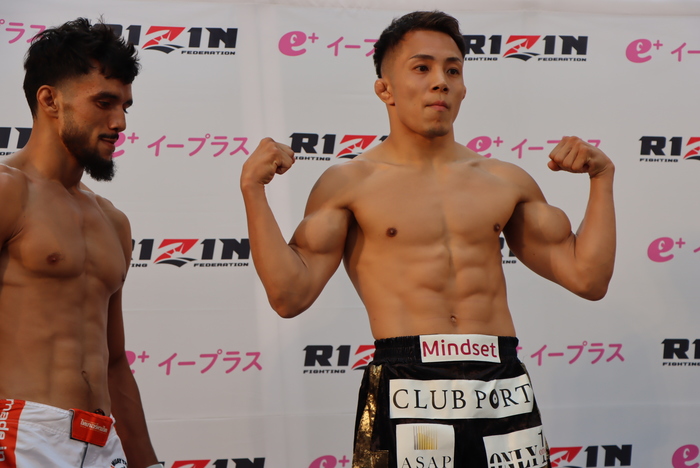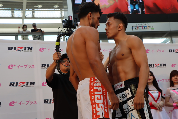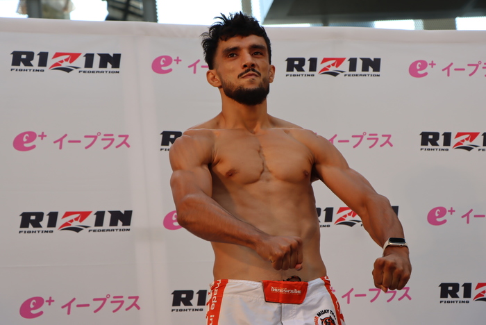 第13試合のRIZINフェザー級(66kg)5分3Rで対戦する、イルホム・ノジモフ(ウズベキスタン/Tiger Muay Thai)は65.7kg、新居すぐる(HI ROLLERS ENTERTAINMENT)は65.85kgでそれぞれ計量をパス。
