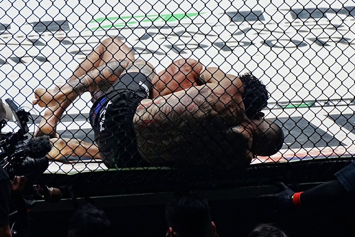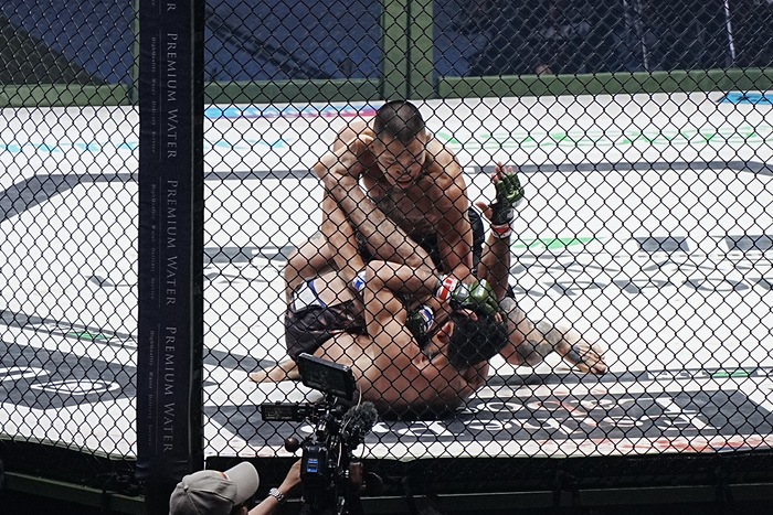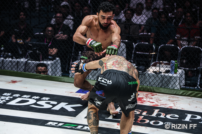安藤は右ショートを当てて立ち上がって来たガサンザデに、テイクダウンのフェイントから左ストレートを当ててダウンを奪うと、足はかけずも先に腕を巻いてリアネイキドチョーク! 最後はパームトゥパームでタップを奪った。