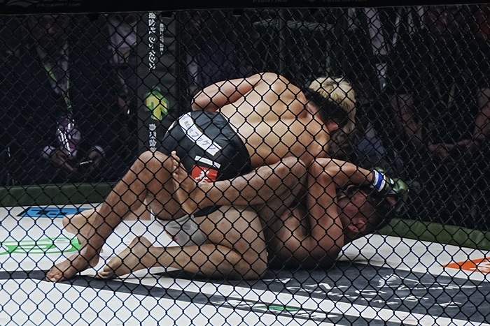 1R、サウスポー構えで先に前に出るのは西川。オーソの堀江は西川の左の蹴り足を掴んでテイクダウン。ハーフから堀江を抱き寄せ、かかとで腿を蹴る。しかし、ハーフの堀江は首を抜くと西川の頭の横に顔をつけて細かいパウンド。西川を立たせない。残り50秒でマウントに。強いヒジを打ち込み、西川は腕でブロックも、半身になるとパウンド連打! 被弾して動けない西川に、レフェリーが間に入った。