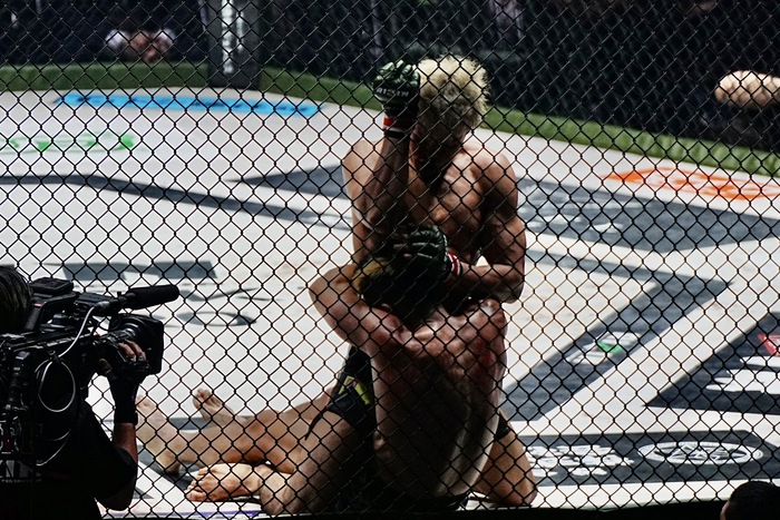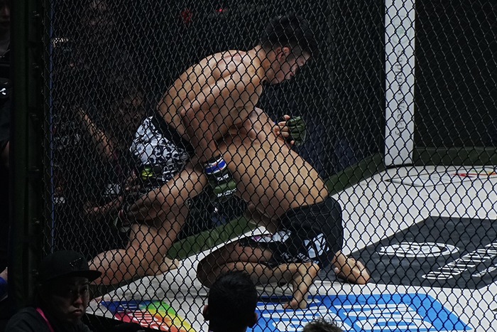 喧嘩四つで前手を合わせて詰める鈴木は右ロー。ケージ背にした山本はシングルレッグからダブルレッグに移行も片手を着いて立ち上がる鈴木が突き放して前に。