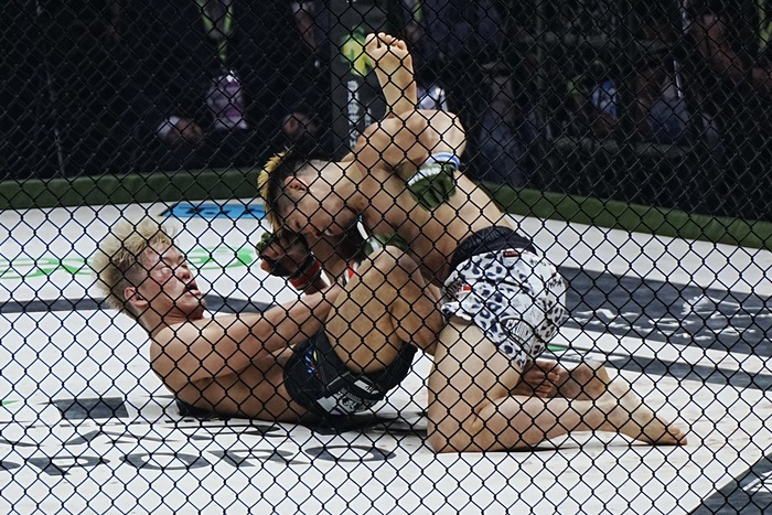 右前蹴りの山本はダブルレッグに入る鈴木。潰した鈴木が上に。下の山本は三角絞めも、肩を入れてインサイドガードに入った鈴木。山本の蹴り足を払う鈴木。スリップした山本は鈴木が飛び込むところになおも三角絞めも、鈴木は山本に組まさせずに抜いて踏みつけ。最後も消耗した山本の組みを切ってトップでゴング。山本に勝機を与えず、判定勝ちした。