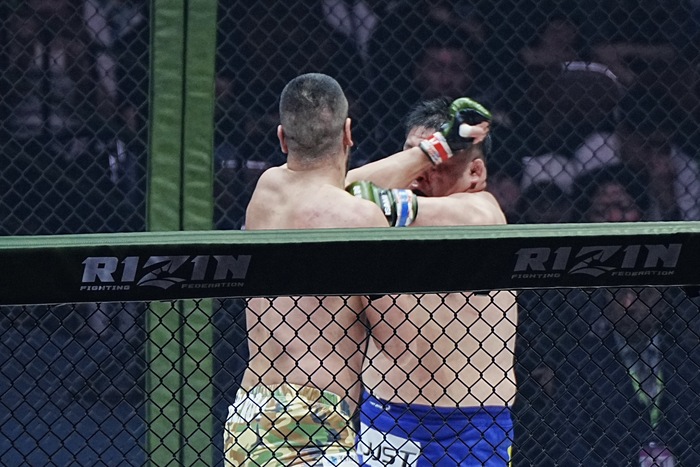 右オーバーハンドの荒東。それをブロッキングのカリミアンは荒東の左右に左を合わせる。カリミアンの指が目に入ったか、顔をしかめた荒東に、左右連打。ガードで凌ぐ荒東はケージ背を出て左を当てるが、荒東の飛び込みには右ロー。カリミアンは丁寧に打撃を突く。