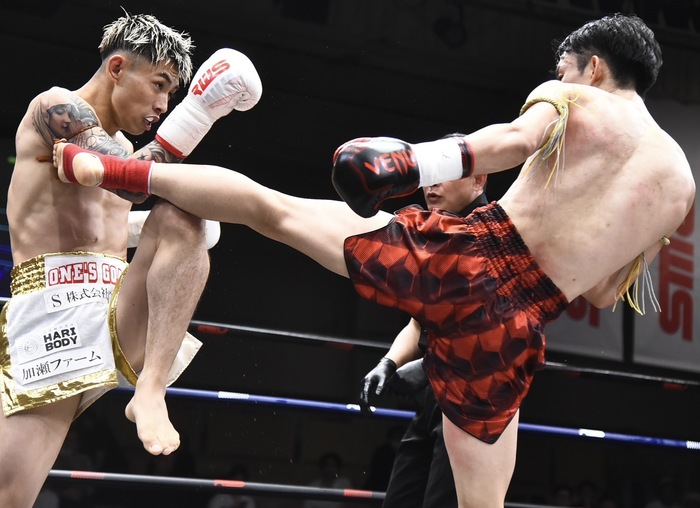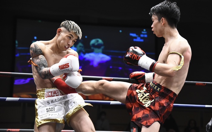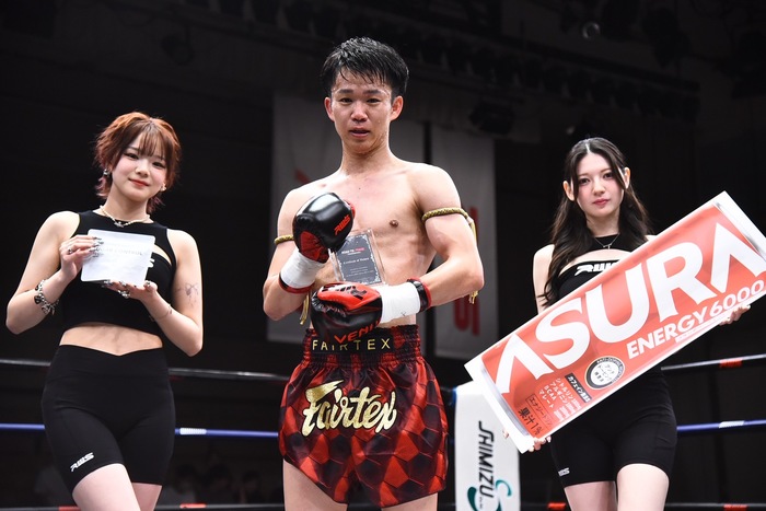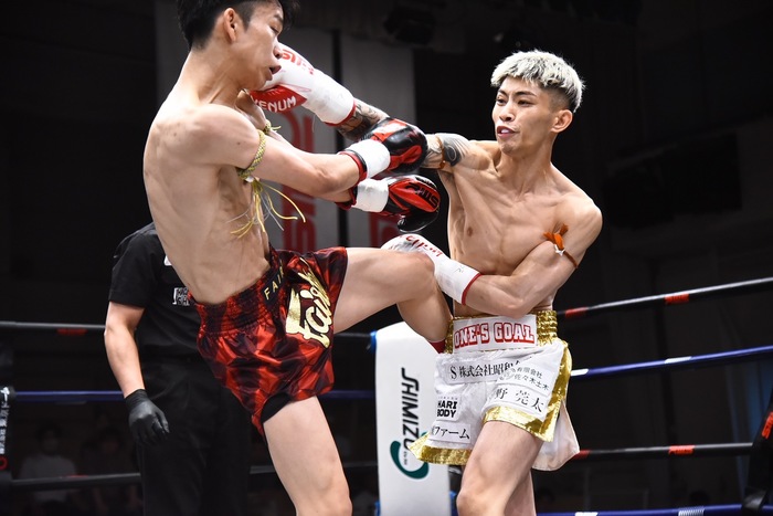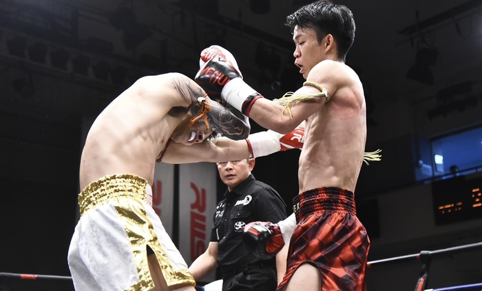 3Rは篠崎も前へ出てきてパンチを出すとエイジは左ミドル。パンチの距離での打ち合いとなり、篠崎が右でヒットを奪う。ミドルを蹴っていくエイジに篠崎は組み付いて同体で倒れる。前蹴りと左ミドルを当てていくエイジに篠崎はほぼ手が出ず組み付く。