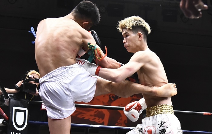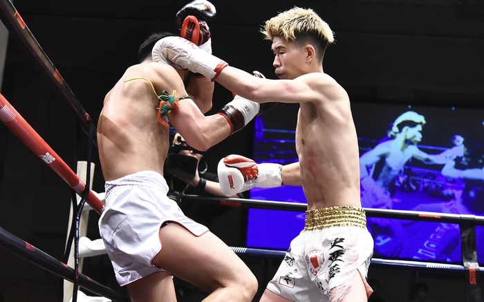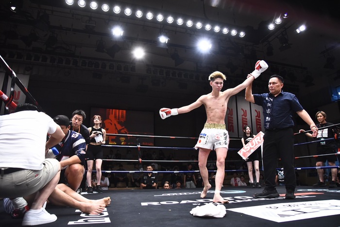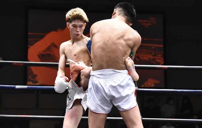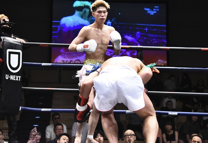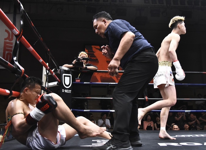 1R、身長で上回るサウスポーの吏亜夢はジャブ、ボディへの前蹴りから顔面への前蹴り。左右フックから左ミドルを蹴ると、ダウサコンはうずくまってダウン。