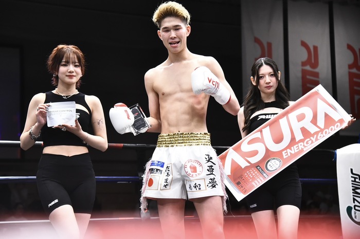 吏亜夢はマイクを持つと「僕は日本で連勝していてスーパーフェザー級では相手がいないので、朝陽選手とフェザー級でやりたいと思っている」と品川朝陽に対戦を表明した。