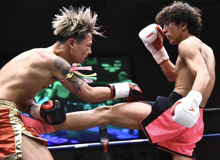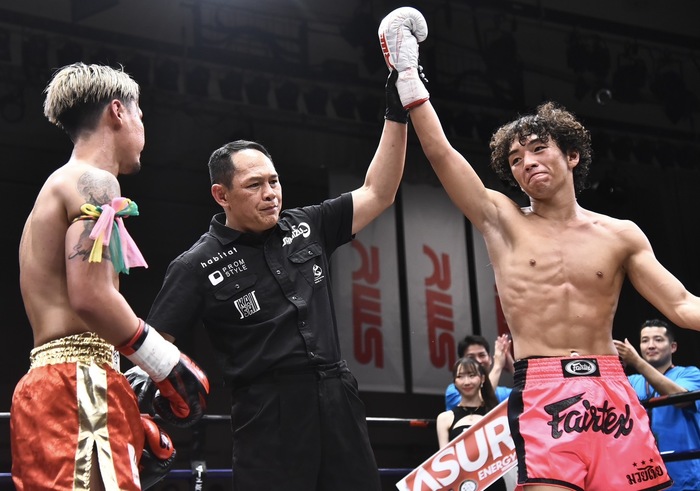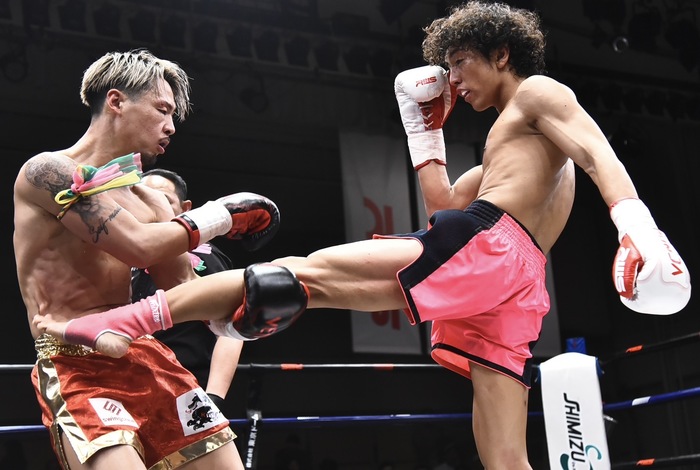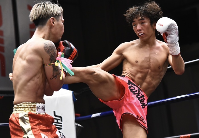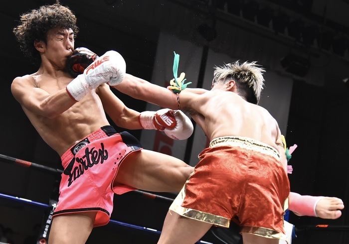 1R、躍動感のある動きから前蹴り、左ミドル、ヒジを打って行くしょーい。皆川は右ストレート、左フックで前へ出るがややトリッキーな動きをするしょーいにやりにくそう。しょーいは右フックをヒットさせ、組み付くと皆川を組み倒す。しょーいが左フックから左ヒジ、さらに右ミドル。オープンスコアは10-9×3でしょーい。