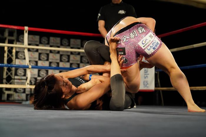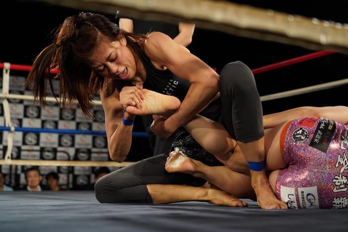 足を組ませない井上は、足を手繰りつつうつ伏せで腕十字狙い。離れる平田。下の井上はロールして平田の右足をすくいに。抜いて離れてからアタックの平田は井上のインバーテッドからのトーホールド狙い、三角絞め狙いも組ませず。