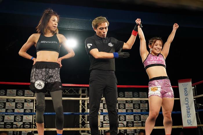 判定3-0(10-9×3)でトップの平田が勝利。コールに少し驚きの表情でセコンドを見た平田は、「今回の試合はすごい格上の選手とやらせていただいてありがたいです。井上選手すごく強かったです。次は総合で出来たらいいなと思います。応援よろしくお願いします」と語った。