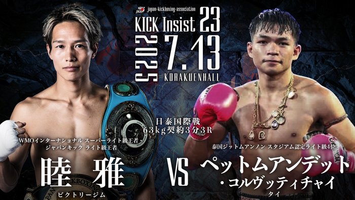 ジャパンキックの2024年度MVPを受賞し、5月の『ONE Friday Fights 110』で勝利したWMOインターナショナル スーパーライト級王者・睦雅(ビクトリージム)も凱旋出場。メインイベント3で、タイ国ジットムアンノンスタジアム認定ライト級4位の現役ランカーであるペットムアンデット・コルヴッティチャイ(タイ)と対戦する。