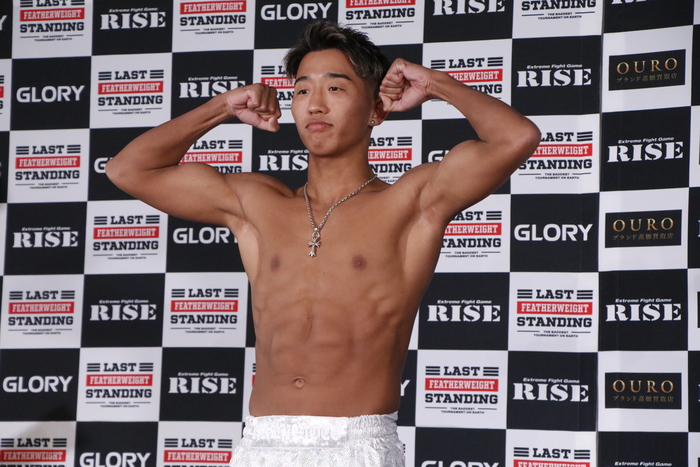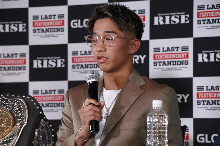王者になっての第一戦は「判定でも面白いのはみんな知っていると思うので、ここは倒すことにこだわって試合をするのもいいかなと。僕はvs.大﨑(一貴)しか見ていないのでそこに見せつけられるような試合をしようと思います」と、RISE世界スーパーフライ級王者・大﨑一貴への宣戦布告となる試合を見せたいと語った。