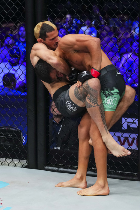 1R、ともにオーソドックス構え。カルーソの左インローに股間を押さえたセンシだが、続行。シングルレッグから右で差して押し込むカルーソにセンシはギロチンチョークへ。