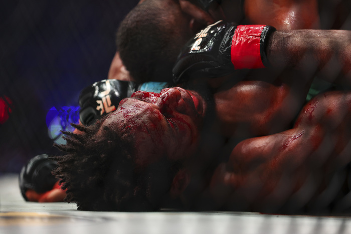 鼻頭から出血するバルナウイ。左右で詰めるコーガンに、バルナウイは再びマウスガードを落として拾いに行くが、そこを詰めるコーガンはパウンド、口内に異常をきたしているのか、下からハーフガードで組みながらもなおもマウスガード拾いに固執するバルナウイ。