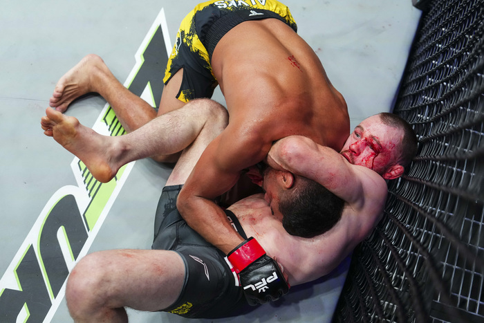 ワンツー、右を当てるアウベス! 顔面から出血のハードリーは右回り。追うアウベスは右ボディ。打撃戦を強いるアウベスは回るハードリーを追って、残り10秒の拍子木にダブルレッグを持ち上げてテイクダウン、首を抱えるハードリーにトップのままゴングを聞いた。