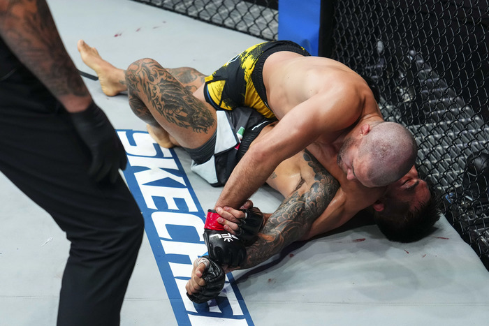 3R、先に詰めたグティエレスは右で差して押し込み。ボディロックから回すが、ここもがぶり引き落とすウェッツェルのプレッシャーに、シッティングで引き込んだグティエレス。金網背に上体を立てているが、立たせないウェッツェルのは上から頭で蓋をしてグティエレスに背中を着かせる。足を手繰り亀になるグティエレスにがぶりからアナコンダチョークを狙うウェッツェルに横回転で回って首を外したグティエレスが、ウェッツェルの組みにギロチンチョークを合わせに行くが、ここも外したウェッツェルがトップから攻めてゴング。