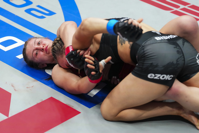 2R、ヒザを触りに行くビショップ。近づくとはがすシャカロワ。ビショップはシングルレッグテイクダウン! 左枕で背中を着かせるとマウント。バックに。両足をボディトライアングルに巻き、リアネイキドチョークへ。いったんは1R同様に後ろ手を剥がしたシャカロワだが、ビショップが組み直してタップを奪った。