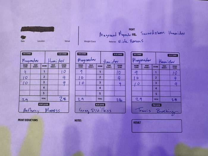 判定は3-0(29-28×3)で打撃を評価されたか(※ジャッジ3者ともに2、3Rをマゴメドフ支持)。マゴメドフが勝利。ハミドフは苦笑しすぐに背を向けたが、マゴメドフはハミドフを追い、頭をつけて慰めるかのように言葉をかけた。