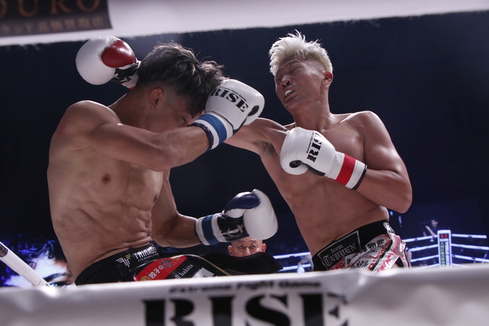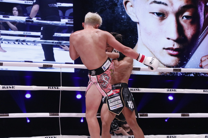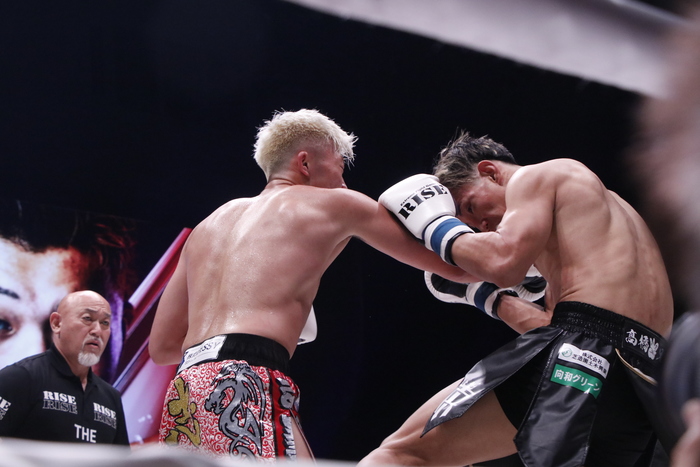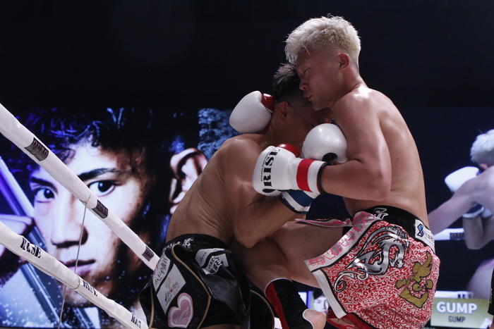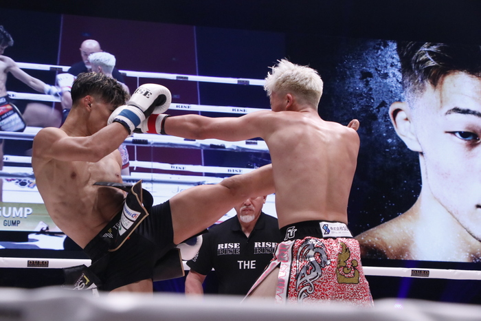 1R、ローの蹴り合いからスタートし、GUMPはパンチとヒザでボディを中心に攻めていく。高橋は左インローを狙い撃ちにするが、GUMPが距離を積めての連打から右ヒザをボディへ突き刺す。
