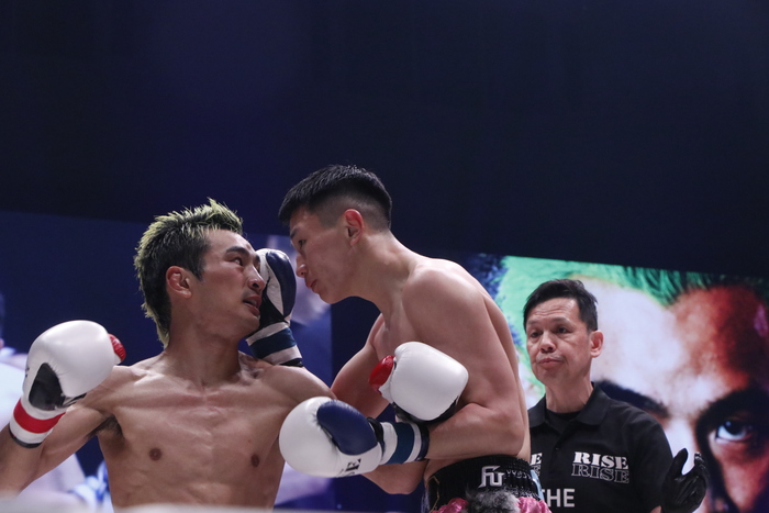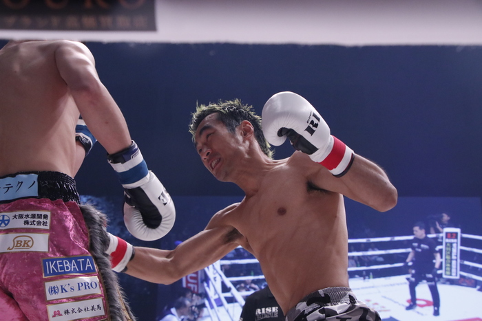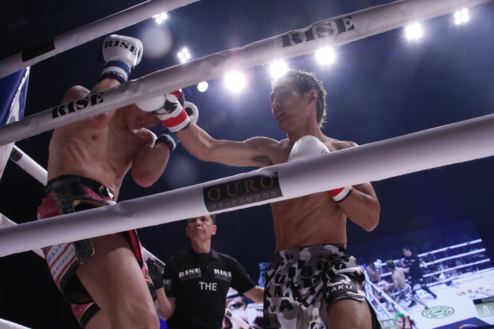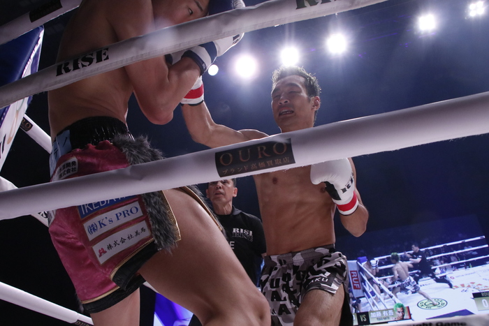 1R、さっそく圧をかけていく加藤に礼司はコーナーまで下がるが、サウスポーからの左ストレートをカウンターで狙い撃ち。左右フック、左ボディで攻めていく加藤にカウンターを打って行く。互いにカーフを蹴る。終盤、加藤が右フックでグラつかせてパンチをまとめた。