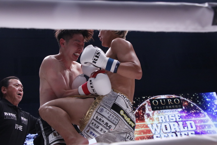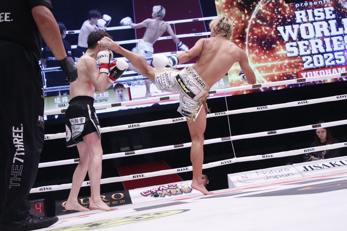 2R、序盤にパンチをまとめた琉樺が左フックをヒットさせ、グラついた財津に連打を浴びせてスタンディングダウンを奪う。