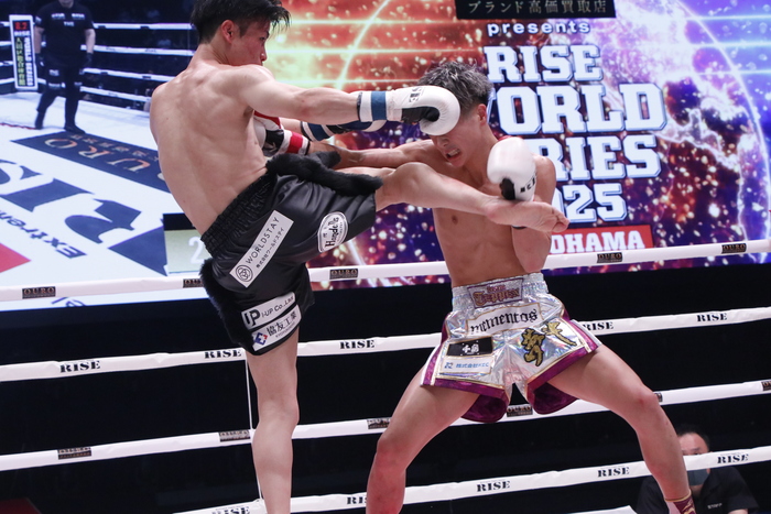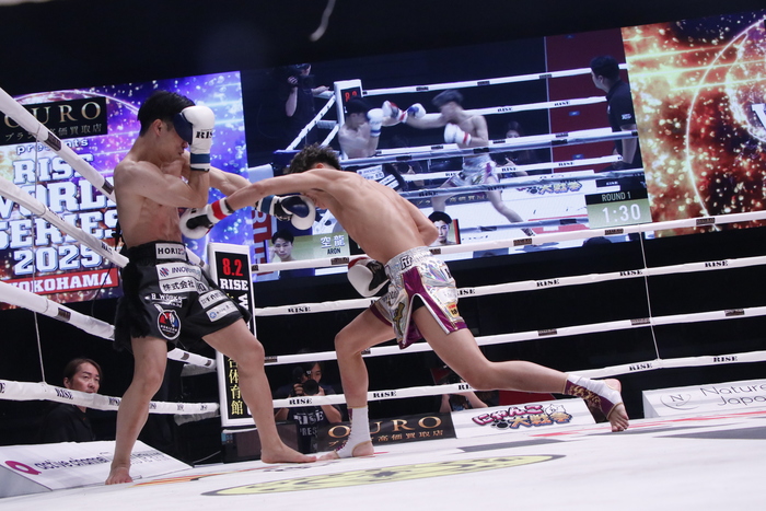 1R、サウスポーの水野は序盤からアグレッシブに動き、ワンツーからの飛びヒザ、パンチのコンビネーションを繰り出していく。空龍は右カーフを蹴っていくが水野の攻めにロープやコーナーを背負う場面が多い。