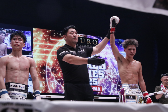 3Rは空龍が前に出る。右ストレート、左フックで迎え撃つ水野だが、このラウンドは空龍が左ストレートを当てていき、水野は組み付きが多くなる。最後は打ち合い行った空龍に水野が右をヒットさせ、判定3-0で水野が勝利した。