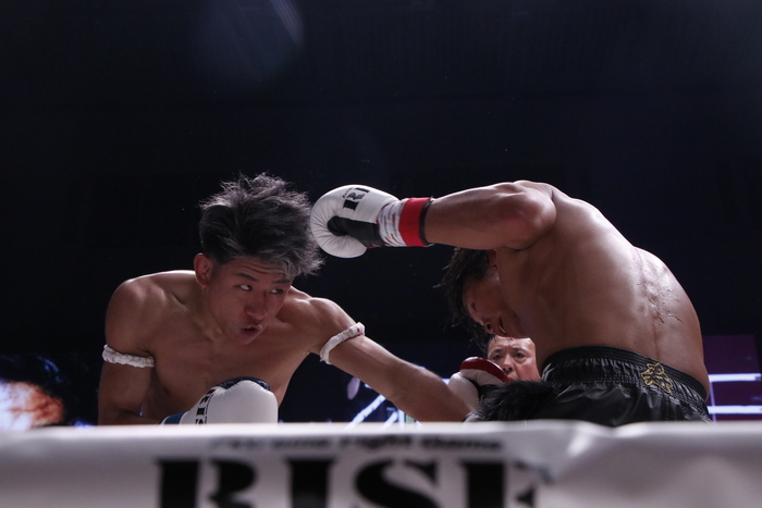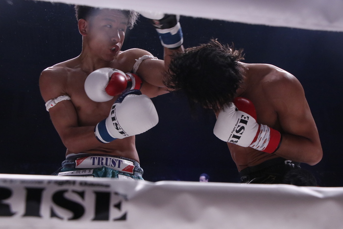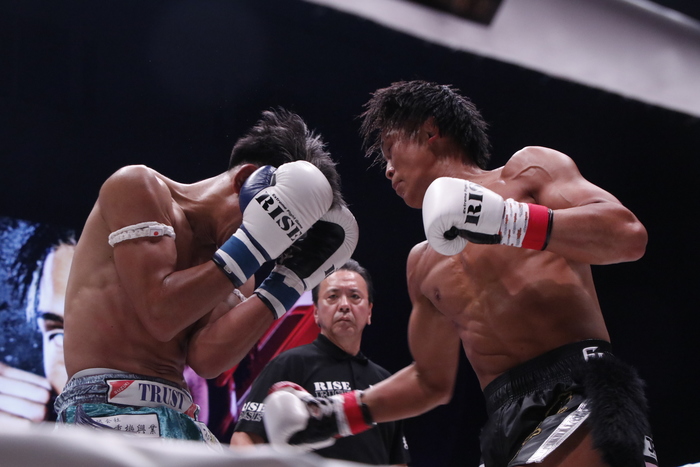 2Rは激しい打ち合いに。両者のフックが危険な距離で交錯する。その中でヒットを奪っていくのは鈴木。左ボディ、アッパーに加え、戸井田が頭を下げるとすかさずヒザを突き上げる。