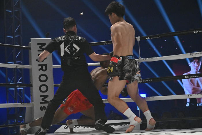 1R、古木が右カーフを蹴るとモタは飛び後ろ廻し蹴り。モタが左ボディからの左フックを繰り出すが、古木が右フックを返すと一発でダウンに。